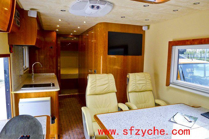 六驅(qū)越野房車車身內(nèi)整體豪華配置:在駕駛室中還有主流卡車中配備的天窗通風(fēng)系統(tǒng)和后排折疊床板,這款越野房車的后排內(nèi)部具有地板加熱系統(tǒng),獨立的會客廳,高級絨布真皮座椅具備多項可調(diào)功能,雖然包裹感不是很強(qiáng),但卻有一定的支撐性,更加符合越野房車的特質(zhì)。此外,中央空調(diào)、天窗與側(cè)窗外加頂部迎賓燈的點綴是恰到好處,前后對著的兩臺大尺寸液晶電視方面中央四位乘客觀看。在門口的兩側(cè),分別是吧臺和迷你廚房,電磁爐、微波爐、冰箱應(yīng)有盡有。車門頂部設(shè)有整車電路控制面板,可通過開關(guān)控制燈光、車門等等。干濕分離的衛(wèi)生間分別分布在客廳旁與臥室中,其中一間設(shè)有浴盆和真空馬桶,另一間則配有恒溫淋浴,走廊的盡頭就是這間臥室,其擁有電控臥室門,獨立中央空調(diào)、屋內(nèi)整體照明系統(tǒng)與液晶電視,此外整間臥室采用了實木裝潢,超寬的雙人床鋪足夠車主享用。