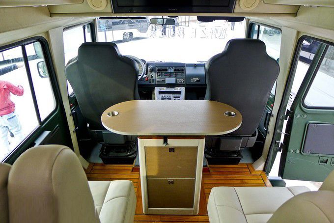 越野房車內(nèi)飾:可以看到,柚木地板外加兩個(gè)電動(dòng)座椅與一個(gè)帶儲(chǔ)藏柜的可移動(dòng)多功能桌構(gòu)成了這輛越野房車的第二排。除此之外,頭頂上方安置有26寸索尼液晶電視和帶衛(wèi)星電視機(jī)頂盒的藍(lán)光播放器,微波爐烤箱、小型冰箱、電磁爐等常用設(shè)備也是一應(yīng)俱全,當(dāng)然恒溫式的出水系統(tǒng)以及真空馬桶、獨(dú)立淋浴也是一樣不少。具備天窗和側(cè)窗的尾箱處安置有兩張舒適的標(biāo)準(zhǔn)床鋪,可以說盡管這輛U5000并非加長特裝版,但所有居住設(shè)備都很齊全。