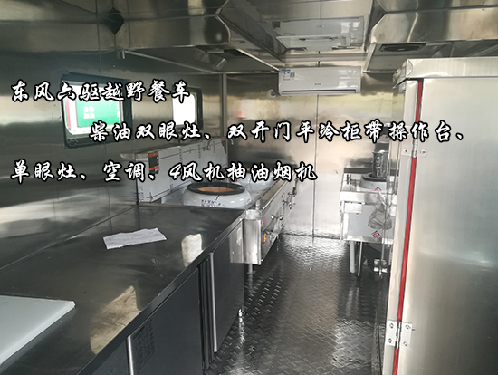 東風(fēng)六驅(qū)越野餐車車輛概述:采用東風(fēng)國五越野底盤改裝, 車廂材質(zhì)采用外冷軋鋼板,內(nèi)飾不銹鋼,中間保溫層,隱藏式上車踏步,頂部安全窗,兩個(gè)副食灶,一個(gè)蒸飯車,抽油煙機(jī),平冷柜,水路,電路,油路等。